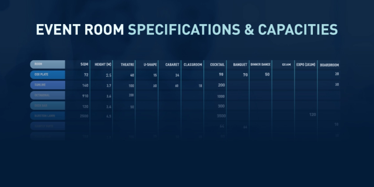 Click to browse the different capacities by event rooms at the Moonee Valley Racing Club.